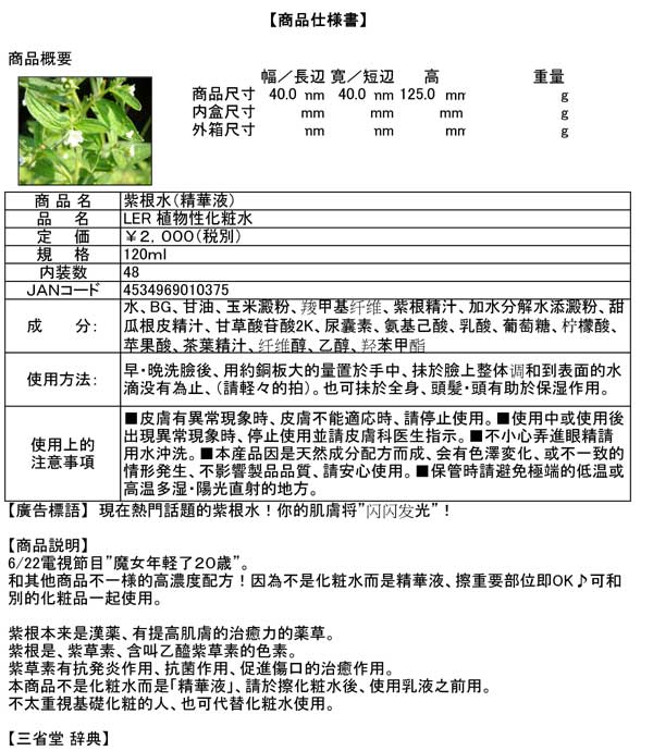成分:水、BG、グリセリン、グリコシルトレハロース、セルロースガム、シコンエキス、加水分解水添デンプン、マグワ根皮エキス、グリチルリチン酸2K、アラントイン、アミノカプロン酸、乳酸、グルコース、クエン酸、リンゴ酸、チャ葉エキス、イノシトール、エタノール、メチルパラベン